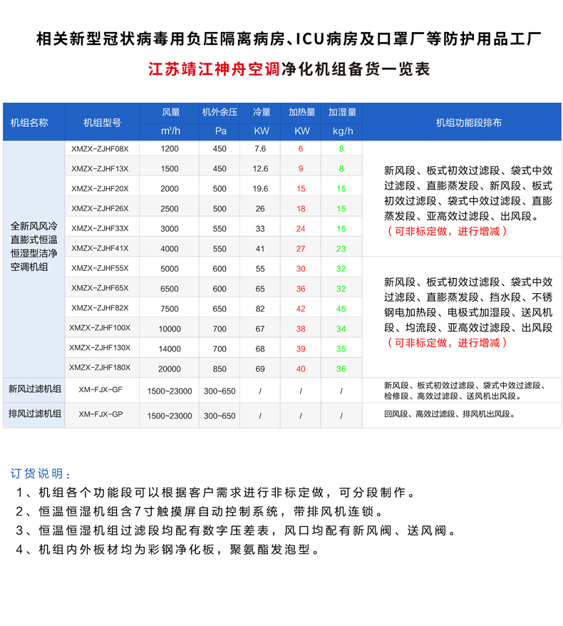 靖江市神舟空调设备制造有限公司——组合式空调机组提供独特的组合设计,混合段、过滤段、表冷段、加热段、加湿段、消身段、风机段、喷淋段、热回收段、轮转出时段等功能段独立制造,再依据不同的使用要求加以组合,从一般性的舒适性空调用途到要求严格的医院手术室及集成电路无尘室等洁净工艺性空调均可满足要求。机组的高度和宽度可以灵活选择以适应现场条件对机组外形尺寸的需要。可以散件发运至工地,再在现场安装组合。